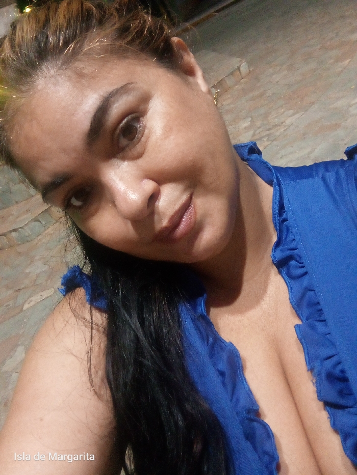 A close-up, upward-angled selfie depicts an adult female with dark eyes, dark eyebrows, and a subtle closed-mouth smile. Her long hair is predominantly dark brown to black, with lighter, reddish-brown highlights visible at the crown. She wears a royal blue garment featuring ruffled trim along the neckline and shoulders, with a low-cut front revealing cleavage. A thin, gold-colored earring is visible on her right ear. The background is out of focus, appearing as a textured surface resembling a stone or brick wall, illuminated by dim artificial lighting. A faint light source is present in the upper-left background, creating a subtle flare near the subject's forehead. White text in the lower-left corner identifies the location as "Isla de Margarita," a Venezuelan island that includes the city of Juan Griego.
