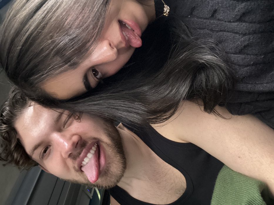 close-up of a man and a woman. The man is on the left side of the image, and the woman is on the right. He is wearing a black tank top and has short brown hair, a beard, and is sticking his tongue out. She is wearing a black sweater, has long black hair that covers her left eye, and is also sticking her tongue out. They are both looking at the camera. The image was taken in Weehawken Township, New Jersey, United States. The image appears to be a selfie, with the couple leaning towards each other. The location of the photo cannot be determined based on the image alone.