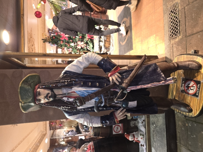 A display of a Jack Sparrow figure stands outside a store, adorned with a Christmas tree visible in the background
