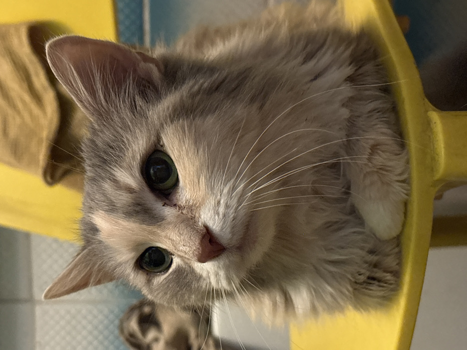 - "A close-up shot captures a gray and beige cat with green eyes, resting its head within a yellow object" by FM-fLERp2, licensed under CC BY 4.0