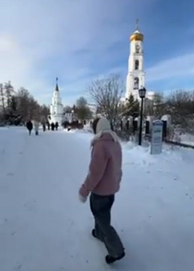 A woman in a pink jacket, dark pants, and a white head covering walks along a snow-covered path. The scene features several white buildings with architectural features, including a tall, white bell tower with a golden dome. Other people are walking on the path in the same direction as the woman. The sky is blue with sparse clouds. The surrounding landscape is blanketed in snow, and bare trees are visible. A sign post is visible. In the distance, more buildings can be seen. The camera follows the woman as she turns to face the camera and gestures with her hand, then she turns back to walk again. The camera then pans to the left, showing more of the snowy landscape and buildings in the distance. The camera continues to move forward along the snowy path. There are piles of snow beside the path. More people are visible in the distance.