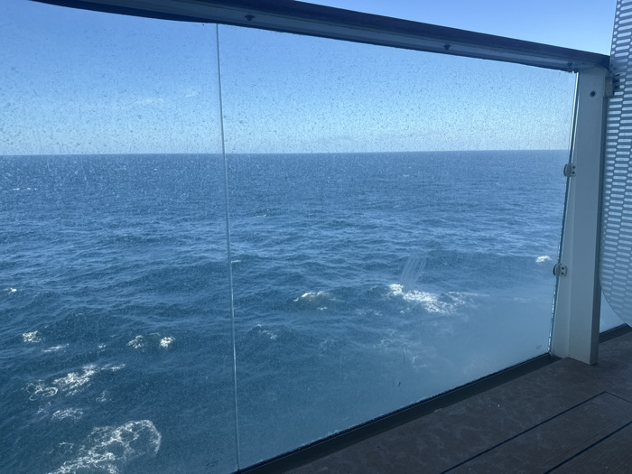 A view of the ocean is framed by a glass barrier, likely from a balcony or deck. The glass has numerous water spots, obscuring the otherwise clear horizon where the blue sky meets the blue sea. Some waves are visible below. The balcony floor has a brown wooden plank design. A white vertical structure is visible on the right of the barrier.