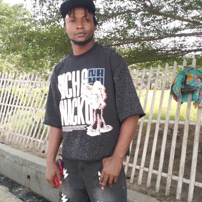 A single adult male is depicted standing outdoors in Unknown, Unknown. The subject, appearing to be of African descent, mid-20s to early 30s, wears a dark cap, a short beard, and his hair appears to be in dreadlocks or braids with beads on his forehead. He is wearing a black short-sleeved t-shirt with a prominent white graphic print that reads "RICH & WACKO" and features a cartoon character. The t-shirt also exhibits small white speckles. He is also wearing dark jeans with white lightning bolt or star-like patterns on the upper thighs. His left hand is in his pants pocket, and his right hand holds a red object, possibly a mobile phone or its case. He is positioned next to a concrete curb or gutter, with a white slatted fence behind him. Beyond the fence is a grassy area and trees with green foliage under a bright sky. A piece of colorful, patterned fabric is draped over the fence on the right side of the image. The male subject faces the camera directly, standing in a stationary posture.