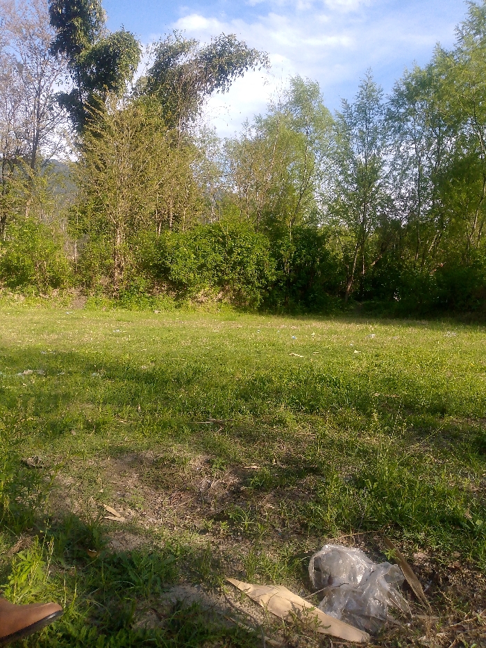 The image displays an outdoor, undeveloped natural area in Janu Mandi, Pakistan, under a sky with scattered white clouds. The foreground consists of sparse green grass intermixed with areas of exposed soil. In the bottom right, a crumpled, translucent plastic bag and a piece of light brown fibrous material (possibly cardboard) are present on the ground. A partial view of a brown shoe or boot is visible in the bottom left corner. The midground shows an expanse of green grass, with scattered small pieces of white or light-colored litter faintly discernible. The background features a dense line of varying trees and bushes, forming a natural boundary. Taller trees with visible trunks rise above the undergrowth. In the far left background, a faint outline of distant mountains or hills is visible. No individuals are depicted, and no specific actions or interactions are occurring.