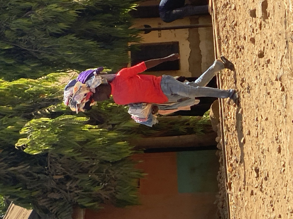 An individual with dark skin, wearing a red short-sleeved shirt and light blue jeans, walks from left to right across the foreground of an unpaved, rocky dirt path. This person carries a large, multicolored bundle of fabric or clothing balanced on their head and a smaller bundle of light-colored fabric in their left arm. They wear dark sandals or flip-flops. In the midground, behind the walking individual, are several trees with dense, green foliage and slender trunks. To the left, a building with an orange-brown wall is visible, featuring a rectangular green panel at its base. To the right, another building with a light-colored wall, possibly beige, has dark rectangular window openings. Partially visible text on this wall reads "NSE DUE OF". A second individual is partially visible on the far right, bent over, wearing dark clothing. The scene is illuminated by strong sunlight, casting distinct shadows on the ground. This activity occurs within the city of Maigizo, Nigeria.