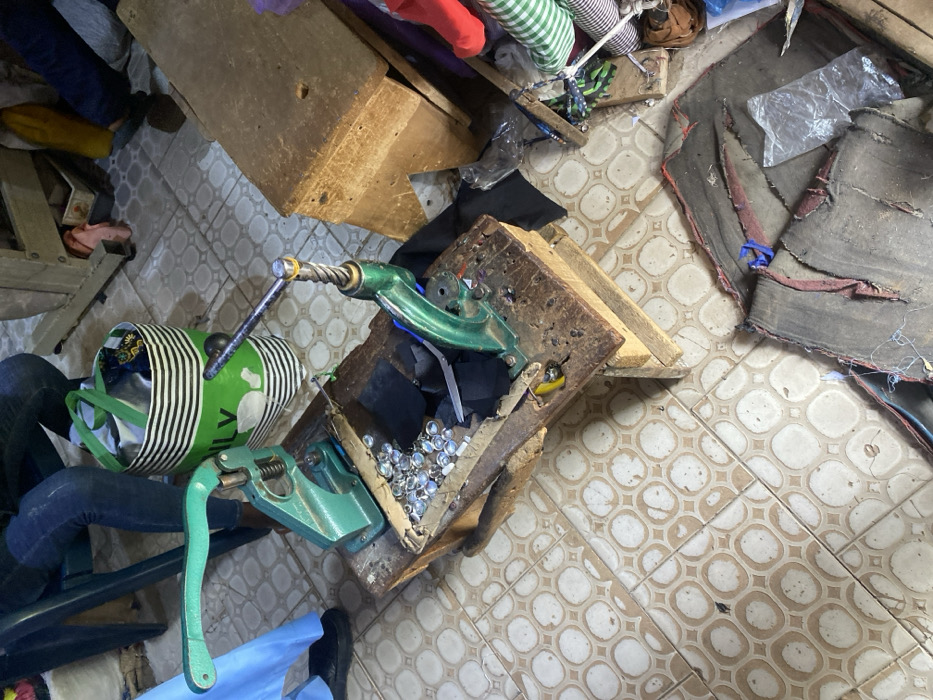 This image captures an indoor workshop or commercial space located in Jos, Nigeria, focusing on a workstation for garment or accessory production