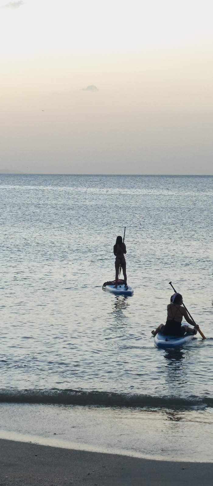 The scene depicts a coastal area in Juan Griego, Venezuela, at either dawn or dusk. Two individuals are engaged in paddleboarding on calm, rippled ocean water. In the foreground, a narrow strip of dark sand transitions into the water, where a small wave breaks. The water surface displays subtle reflections of the sky above. In the mid-ground, closer to the viewer, one individual is seated on a light blue paddleboard, facing away. This person wears a dark-colored swimsuit with a crisscross back and a light head covering, actively propelling the board with a paddle featuring a yellow blade. Further into the water, a second individual stands upright on a similar light blue paddleboard, also facing away. This individual wears a dark two-piece swimsuit and holds a dark paddle vertically. A dark object is secured to the rear of their paddleboard. The horizon line is clear, separating the water from the sky. The sky is predominantly light-colored, transitioning from a pale white at the top to a faint yellowish-grey near the horizon. A few indistinct clouds are visible, along with a small, dark avian silhouette in the upper left quadrant. No other land features are distinctly visible beyond the immediate shoreline.