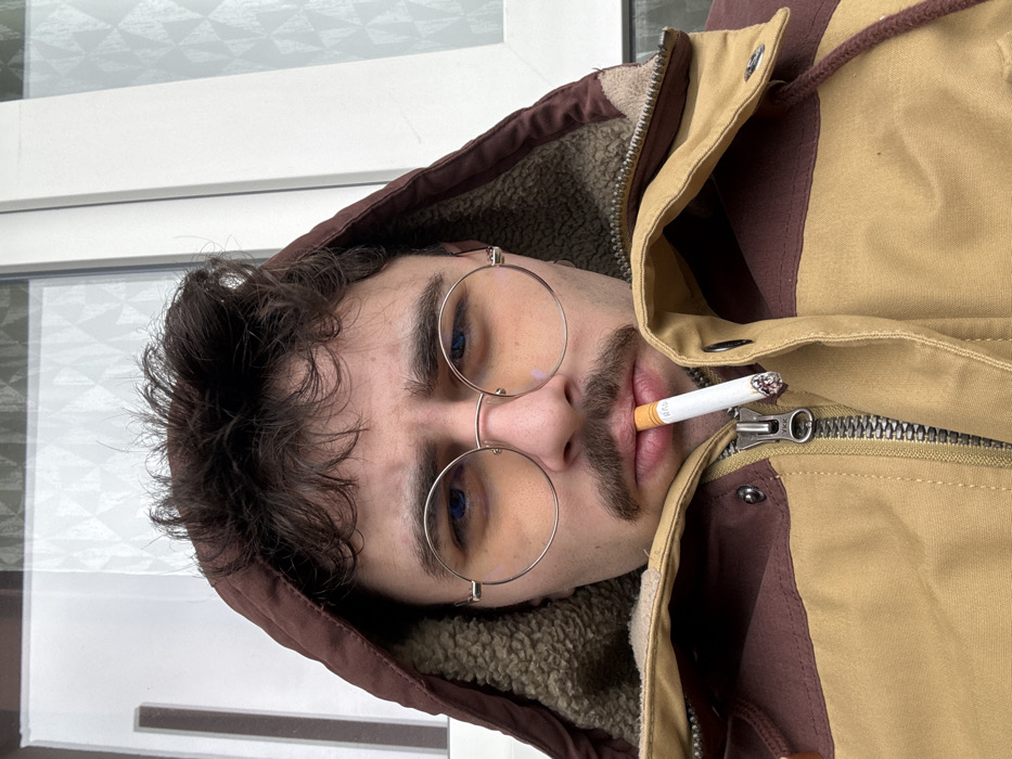 A close-up, frontal portrait features a male individual, located in the city of Rennes, France. The subject has dark, curly hair and a prominent mustache. He is wearing round, wire-frame glasses with amber-tinted lenses, through which his blue eyes are visible. A lit cigarette, with visible ash, is positioned between his lips. He is dressed in a hooded winter jacket; the hood and shoulder sections are dark brown and lined with light brown faux-shearling, while the main body of the jacket is tan. The jacket features a visible metallic zipper (YKK branded) and snap buttons. The background consists of a white-framed structure, likely a window or door, with patterned glass displaying a repeating geometric design.