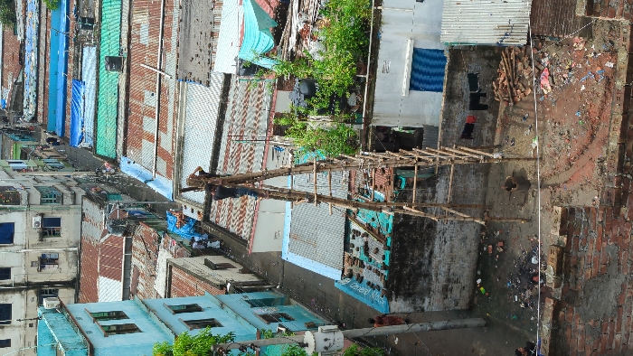The image displays an elevated perspective of a densely populated urban area in Narayanganj, Bangladesh. Central to the frame is a tall, multi-tiered bamboo scaffolding. An individual in dark clothing is positioned high on the scaffolding, engaged in an ascent or work activity. A second person is partially visible at the base of the structure. Directly below, a small ground-level space contains scattered debris, a dark bucket, and laundry hanging against a wall. A rooftop garden with potted plants is situated to the right. To the left, a light blue multi-story building borders a narrow street where a utility pole with a transformer stands. A woman in a brown saree walks along this street. The background shows a long, narrow street extending into the distance, flanked by various buildings predominantly featuring corrugated metal roofs, some with blue or green tarpaulin coverings. Several indistinct figures of people are visible further down the street. The immediate foreground consists of a partial brick wall and a dirt-covered surface with scattered debris.