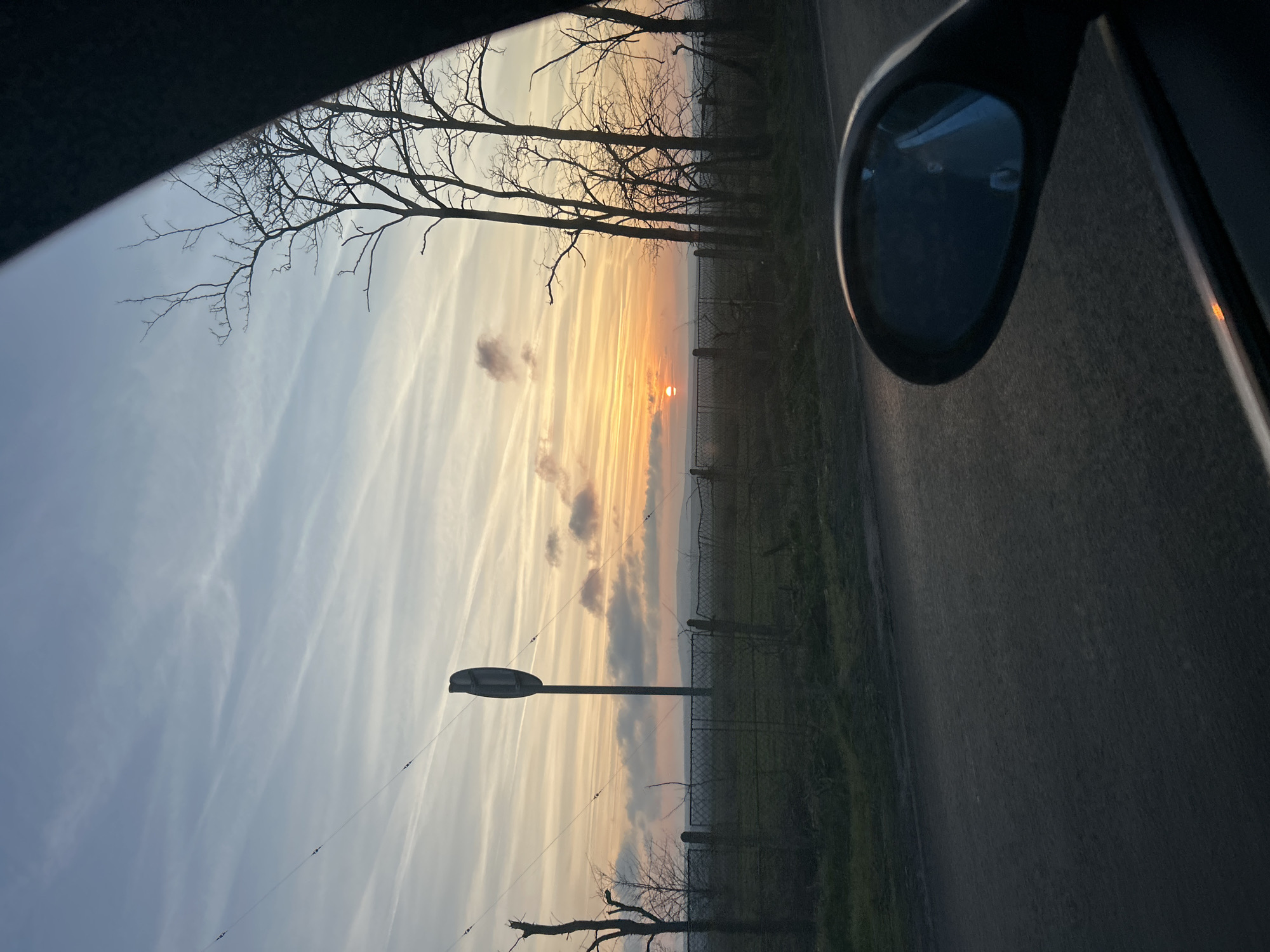 The image depicts an outdoor scene at either sunrise or sunset, observed from within a vehicle near the city of Aytos, Bulgaria