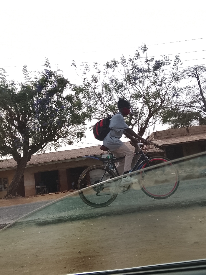 In Jos, Nigeria, a young male is observed riding a black bicycle with red wheel rims on a paved road under a bright, overcast sky. He wears a light-colored short-sleeved shirt, light long pants, white athletic shoes, a red face mask, and a black beanie or cap. A red and black backpack is strapped to his back. The scene is viewed from within a vehicle, with the lower quarter of the image showing a car window and a dirt shoulder. To the left, a large tree with green leaves and purple blossoms stands beside the road. Behind the road, a row of single-story buildings with corrugated metal roofs and earthen-colored walls is visible. Further back, sparsely leaved trees and power lines are silhouetted against the bright sky. The individual is actively pedaling the bicycle from right to left across the frame.