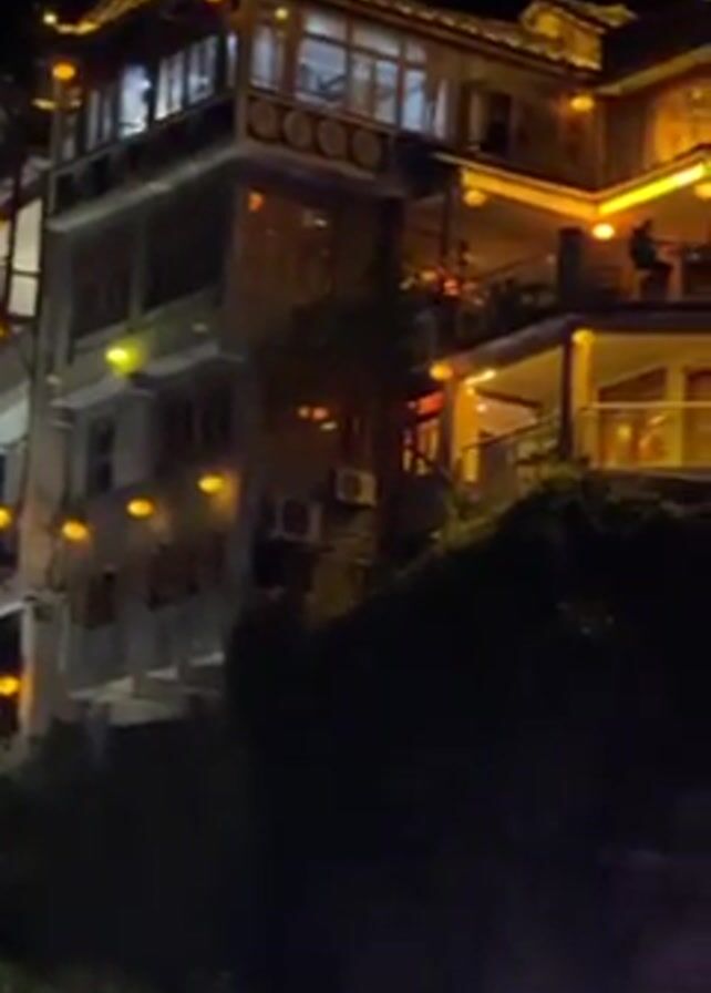 multi-story building at night. The building is illuminated by numerous orange lanterns, some hanging along the side. The architecture appears to be of traditional Chinese style. Several people are visible on the building's open-air balconies. There are air conditioning units affixed to the building's exterior. The structure is built on a hillside. The foreground consists of dark foliage. There is a distinct water sound in the background.