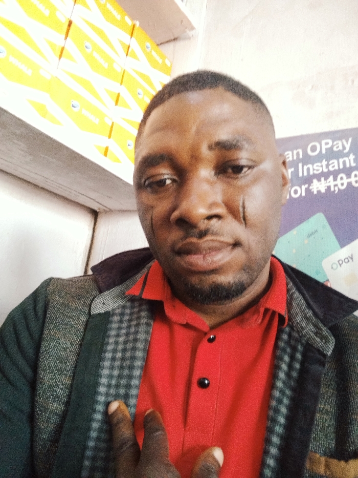 An adult male, approximately 25-40 years old and of African descent, is depicted in a close-up, chest-up shot within an indoor commercial setting located in Fagge A, Nigeria