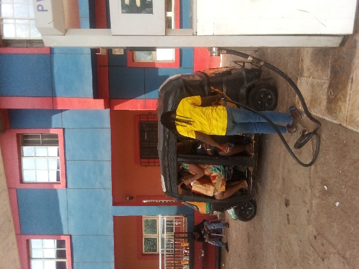 The scene is a gas station in Nnobi, Nigeria, located at the coordinates 6.058 latitude and 6.945 longitude. A man in a yellow shirt is standing next to a black auto rickshaw, holding a fuel nozzle. The rickshaw has two passengers seated inside. A third passenger, a man wearing a blue shirt and jeans, is standing outside the rickshaw on the left side. The rickshaw is being refueled by a black hose, attached to a white gas pump dispenser. The gas station is partially visible on the right side of the image. The building behind the gas pump has red, blue, and orange painted walls with multiple windows. The man holding the nozzle is the only person in the image actively interacting with the other subjects or objects. The ground is made of rough gravel. The scene is sunny and dry.