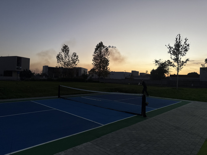 A tennis court is depicted at dusk. The court is blue with white lines, divided by a net. A person is playing on the court. In the background, there are trees and houses, some obscured by a haze that could be smoke. The sky is a gradient of colors, with oranges and yellows near the horizon transitioning to blues and grays higher up. A paved area extends from the side of the court.