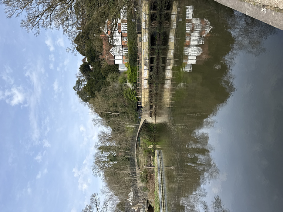 The image displays a serene landscape of the River Wey Navigation in Guildford, United Kingdom. The foreground is dominated by the calm, dark water of the river, which clearly reflects the light blue sky, scattered white clouds, and the surrounding trees and buildings. In the midground, St. Catherine's Footbridge, a concrete or stone arch bridge with dark metal railings, spans the river. A single pedestrian is visible on the bridge, moving from left to right. To the immediate right of the bridge, a structure resembling a wooden fence or barrier runs along the riverbank, separating it from the land leading up to a prominent house. On the right bank, situated on a tree-covered hillside, stands a distinctive multi-story house. It features white walls, dark timber framing (half-timbered style), multiple gables, and a red tiled roof. Other less distinct residential structures are visible higher up the hillside and further to the far left bank. The riverbanks and hillside are extensively covered with trees, predominantly deciduous, which appear largely bare or with minimal early spring foliage. Some evergreen trees are also present, particularly on the higher parts of the hill. A concrete towpath or quay is visible along the immediate right bank in the foreground. The sky is light blue with scattered wispy white clouds.