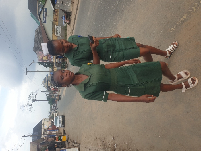 Two young women in dark green uniforms, consistent with nursing attire, walk on a paved street in Umuode, Nigeria