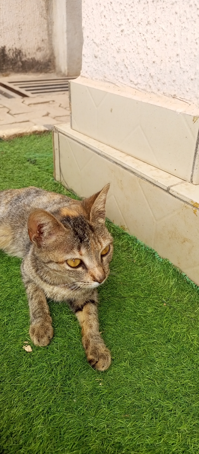 A domestic cat with a striped tabby coat, exhibiting shades of brown, grey, and black, rests on a surface of artificial green turf in Narayi, Nigeria. The cat's eyes are amber. A small, lighter brown patch of fur is visible near its right ear. Its front paws are extended forward, and its head is turned slightly to the right of the frame. To the immediate right and rear of the cat, a multi-tiered architectural base constructed of light-colored tiles supports a textured white wall. In the upper-left background, a paved area with an integrated metal drain cover is visible.