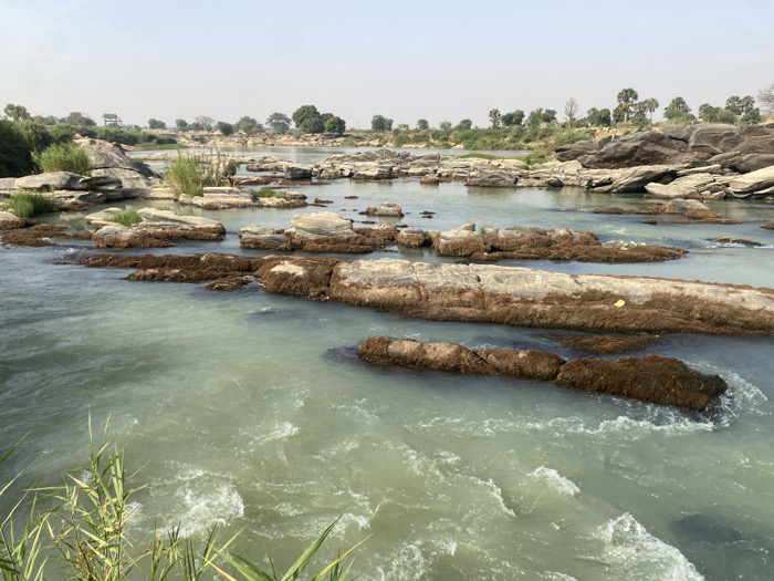 The image displays a wide view of a rocky river landscape situated in Rido, Nigeria, under a clear, bright sky