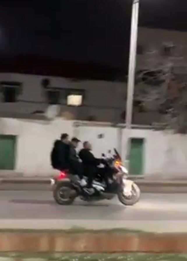 At night, a motorcycle carrying three individuals drives along a city street. The motorcycle is light-colored with a windshield. The riders are wearing dark clothing. The setting appears urban, with streetlights illuminating the scene. Buildings and trees are visible along the sides of the road. As the motorcycle approaches an intersection, cars and pedestrians can be seen.