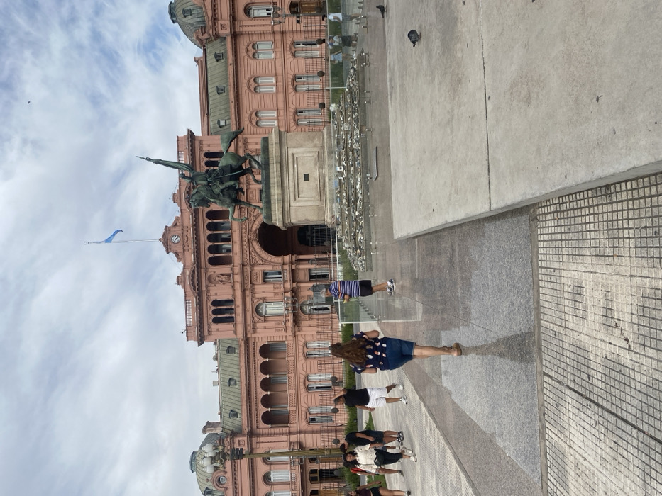 The Casa Rosada, an ornate pink building with a statue and flag, stands prominently