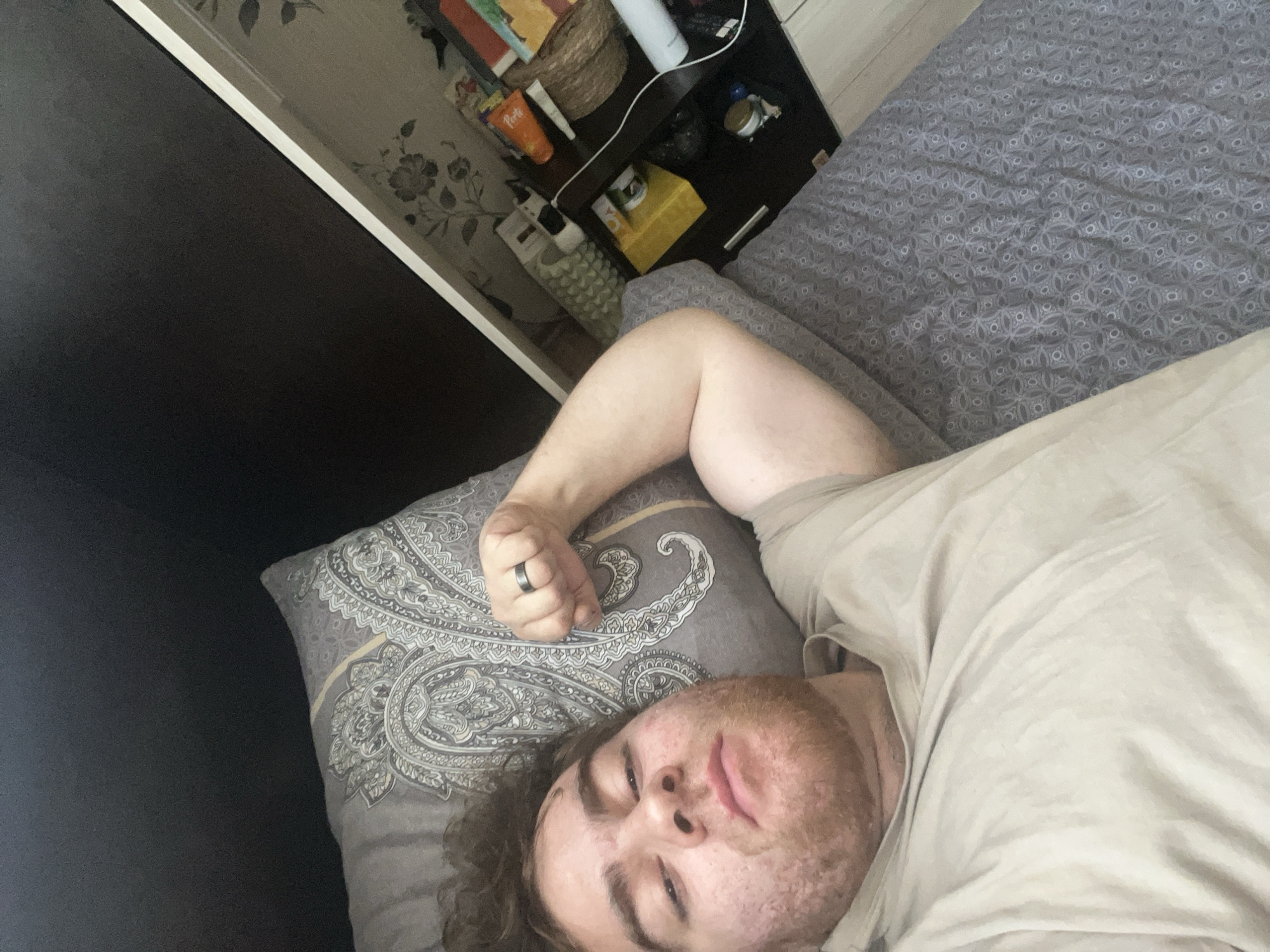 A man lies on a bed in a room. He rests on a gray paisley pillow and wears a light brown t-shirt. A ring is visible on his left hand. A dark brown cabinet stands to the left, and a bedside table with various items is behind his head. The bed has a gray patterned comforter. The location is not discernible as Pernik, Bulgaria.