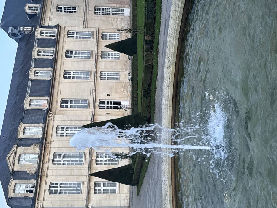 The image displays the courtyard of the Hôtel de Ville (former Abbaye aux Hommes) in Caen, France, under an overcast sky. In the foreground, a circular stone fountain basin contains greenish water, from which a single jet of water projects vertically, creating splashes upon impact. Immediately behind the fountain, a symmetrically arranged garden features two prominent cone-shaped evergreen topiaries. Low, dark green hedges delineate rectangular grassy plots. A light-colored, paved path curves through this garden. The background is occupied by the multi-story, classical-style building facade, constructed from light-toned stone blocks. This structure presents multiple tall, rectangular windows with white frames, some of which appear partially open. The building is topped by a dark, steeply pitched mansard roof, surfaced with slate, which incorporates numerous dormer windows and a small cupola-like structure on the right-hand side. Several large, white-framed double doors are visible at ground level. No individuals are present in the scene.