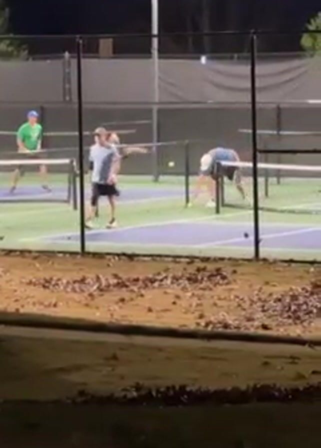 pickleball game being played at night on an outdoor court