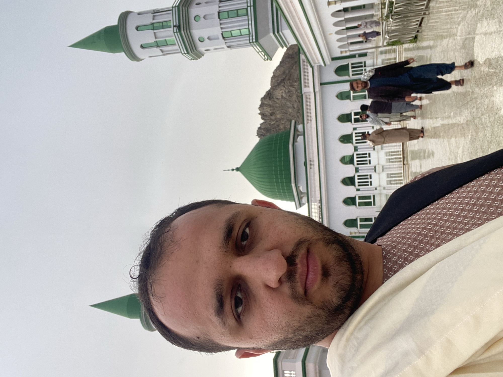 The image captures an adult male in a close-up, selfie-style composition, positioned in the foreground with a neutral expression. He has dark hair and a short beard, wearing a brown patterned top under a dark garment, with a cream-colored shawl draped over his left shoulder. In the midground, a prominent white mosque complex with green architectural elements dominates the scene. It features a large central green dome and at least two minarets with green conical spires and octagonal upper sections. The mosque building includes arched windows and white railings. Several other adult males, dressed in traditional attire including shalwar kameez, are visible walking and standing on the paved, reflective courtyard of the mosque. In the background, rugged, rocky mountains are visible behind the mosque structure, under an overcast sky. This scene is located in the city of Arghandab, Afghanistan.