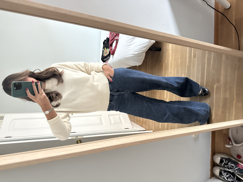 A female subject is depicted standing in a full-length, light-wood-framed mirror, taking a selfie with a smartphone. The subject wears an off-white long-sleeved crew-neck sweater, dark blue wide-leg jeans, and black patent leather flat shoes. A silver-toned watch is visible on her left wrist, and her fingernails are painted red. Her brown hair is styled in waves and partially obscures her face, which is mostly covered by the dark green-cased smartphone she holds in her left hand. Her right hand is placed inside the front pocket of her jeans. The background, reflected in the mirror, shows an interior residential space. To the left, a white paneled door with a gold-colored doorknob is visible against a light grey wall. The floor is light brown hardwood. To the right, a bed with a white ribbed bedspread is present, upon which a black garment with a graphic and a red or burgundy fanny pack are placed. At the bottom left, two pairs of shoes are on the floor: black canvas sneakers and grey, plush animal-shaped slippers with red accents. The location is an indoor room within a residence, likely a bedroom, in Unknown, Unknown.