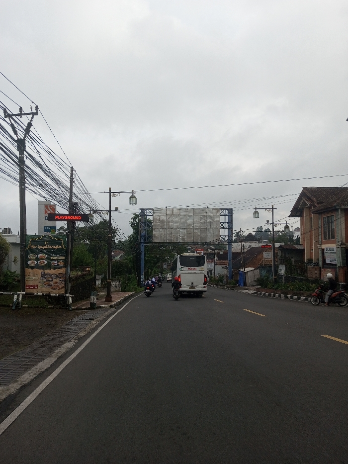 This image captures a street scene in Tangsibi, Bhutan, under an overcast sky. A two-lane asphalt road, marked with a broken white line on the left and double yellow lines centrally, leads away from the viewer. A white minivan-style bus, labeled "PRAJA," travels in the center lane, followed by several motorcycles. On the right shoulder, a red scooter with a helmeted rider is stopped. On the left side of the road, a utility pole is heavily laden with numerous tangled wires. Adjacent to it, a large green billboard advertises "Pita Spanyol Baradith," and a smaller red LED sign displays "PLAYGROUND." An "ATM" sign is partially visible on a building behind these structures. On the right side, an orange-brown multi-story building with a red-tiled roof features a "DIJUAL" (for sale) sign. Further down the road, a large, empty billboard structure spans overhead, supported by blue metal scaffolding. Ornate streetlights line both sides of the thoroughfare. The scene includes pavements, curbs, and minimal surrounding vegetation.