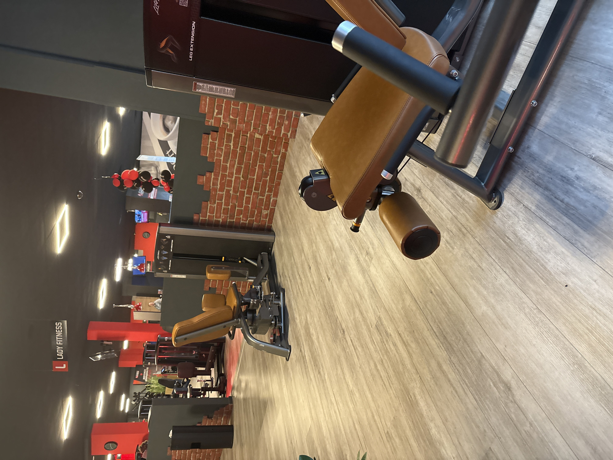 The scene depicts the interior of a "Lady Fitness" gym facility located in Dortmund, Germany. The flooring consists of light-colored laminate wood. Walls are predominantly dark gray, with some sections featuring a faux red brick pattern along the lower half. Red structural columns are visible throughout the space. The ceiling is dark, equipped with rectangular recessed lighting fixtures. In the immediate foreground on the right, a "Life Fitness LEG EXTENSION" machine with dark brown upholstered pads and a black metal frame is positioned. Further into the mid-ground, another gym machine, appearing to be a hip abduction/adduction apparatus with similar dark brown upholstery and a gray frame, is visible. Various other gym equipment is present in the background, including what appears to be cardio machines and additional weight stations. A black cylindrical waste receptacle or speaker stands near a red column on the left. A "LADY FITNESS" sign hangs from the ceiling in the mid-ground. A cluster of red and black balloons is suspended from the ceiling. A wall clock with a black face and white hands is mounted on a red column. One adult male is discernible in the mid-background, standing behind a partition. He wears a light-colored shirt and appears to be observing the area. No specific actions or interactions are occurring. The environment is uniformly illuminated by overhead artificial light sources.