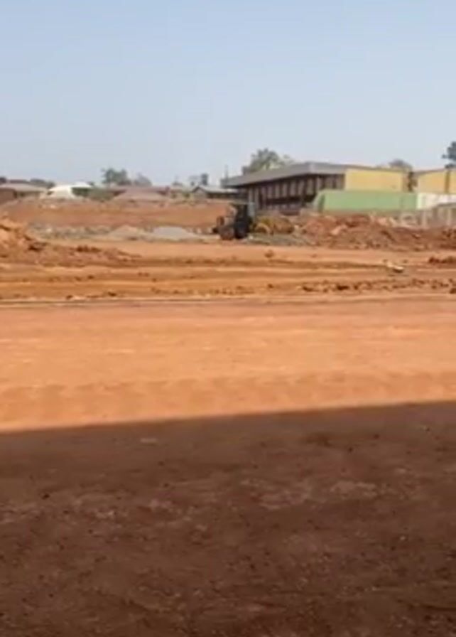 construction site on a sunny day. The ground is reddish-brown dirt. In the background, there is a building with brown trim and yellow walls. A front-end loader is visible among piles of dirt and gravel. A man in a red shirt and dark pants walks across the construction site from right to left. The camera is stationary.