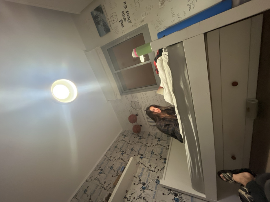 A bedroom features white walls, a window, and a bunk bed. A person is sitting on the lower bunk, facing forward. The bed's side faces the viewer, showing drawers. The wallpaper has writing and a basketball pattern. A light fixture is on the ceiling. A person's leg and foot appear in the bottom right corner.
