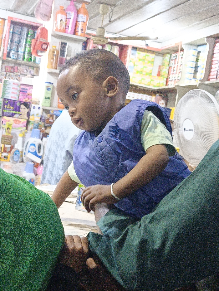 The scene depicts the interior of a retail store located in Gwagwarwa, Nigeria. A young child, estimated as a toddler with short dark hair, is seated in the mid-ground on the lap of an adult, whose dark green-clad legs and hands are visible in the lower foreground. The child wears a light green short-sleeved shirt, a dark blue quilted sleeveless vest, and a silver-colored bracelet on the right wrist. The child's head is turned slightly left, mouth open in a seemingly curious expression. In the background, white shelves are densely stocked with consumer products, including various-colored bottles of liquids (orange, pink, white, blue) and numerous packaged goods. A blurry individual in light grey clothing is partially visible behind the child. To the right, a white "King Kong" brand electric fan is present. A light brown ceiling fan with wooden blades is mounted on a white plank ceiling.