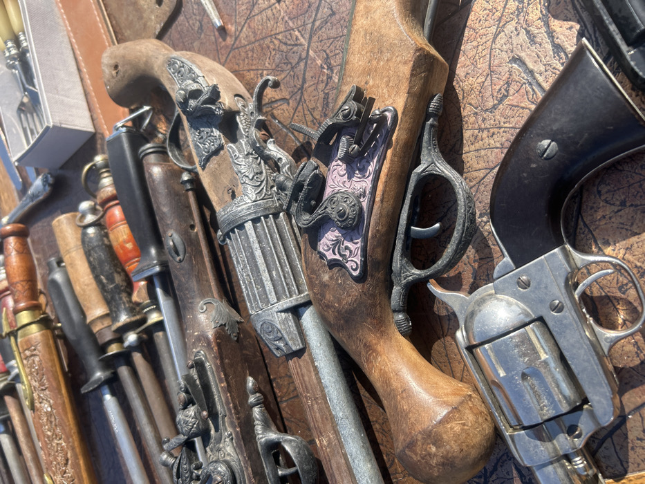 - "The scene depicts an outdoor market stall in Stara Zagora, Bulgaria, displaying a collection of replica antique firearms, knives, and cutlery" by FM-FGMCt1, licensed under CC BY 4.0