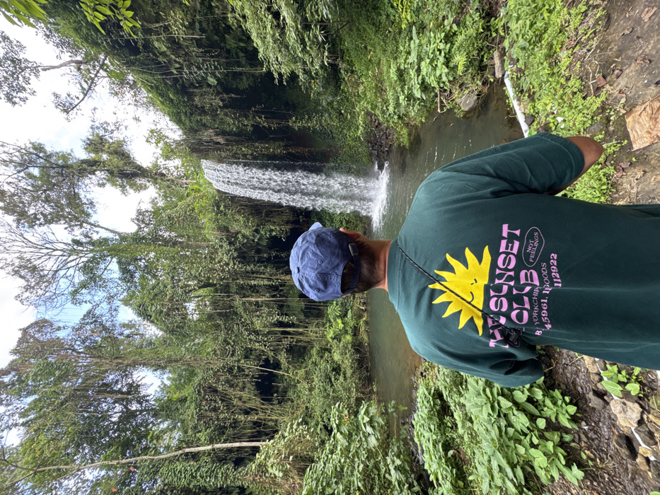 A male individual, viewed from behind, stands facing a waterfall and its associated plunge pool within a dense tropical environment located in the city of Unknown, Indonesia. The person wears a dark blue baseball cap and an oversized dark green short-sleeved t-shirt. The t-shirt's back displays a yellow sun graphic with a sleeping face and pink text reading "MY SUNSET CLUB," "NOT FEELINGS," and other alphanumeric characters including "YORKCHIP," "45961, GOODS," and "112922." A black strap is visible crossing the individual's back diagonally from the left shoulder. The waterfall descends into a calm body of water, bordered by dark rocks and surrounded by abundant green tropical foliage, tall trees, and numerous hanging vines. The immediate foreground features overgrown vegetation, exposed earth, and scattered small rocks. The sky is partially discernible through the tree canopy.