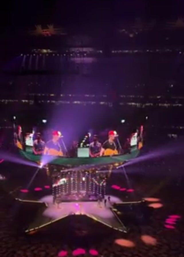 A wide-angle shot depicts a concert within a large stadium. The stage is shaped like a star, illuminated with dynamic lighting effects in various colors, including purple and pink. Onstage, several figures are visible, though their features are indistinct from this distance. Above the stage, a large, curved video screen displays the image of a man playing a guitar and singing. The stadium seating is densely populated with an audience, most of whom are not visible in detail due to the low lighting. The overall atmosphere appears to be dark, with the stage and screen serving as the primary light sources.