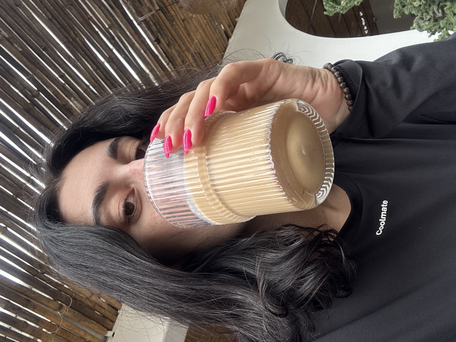 - "A woman holds a ribbed glass filled with a beige liquid, possibly a coffee drink, to her lips" by FM-Oi8nu1, licensed under CC BY 4.0