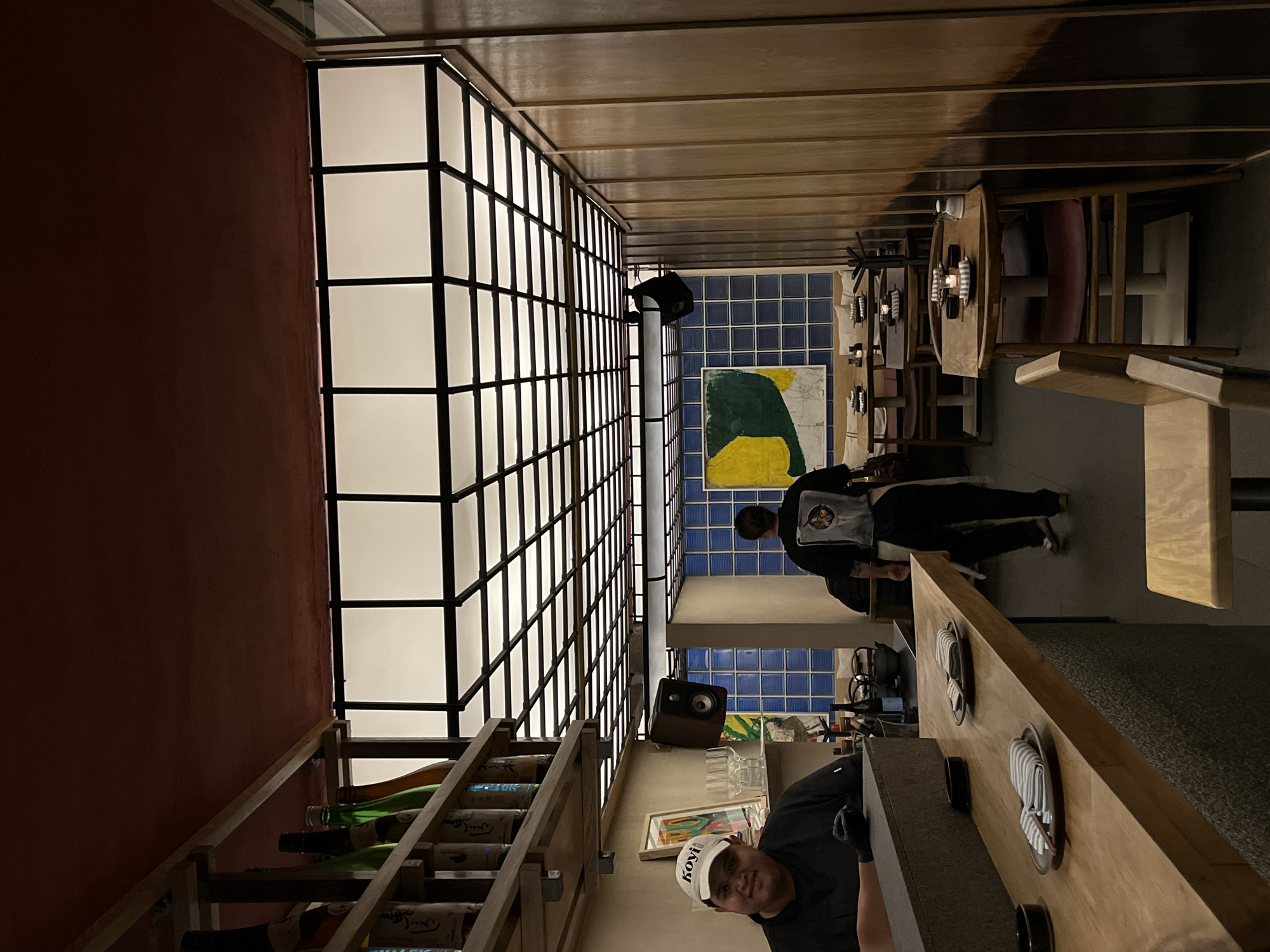 interior of a restaurant, possibly Koji, located in Mexico City, Mexico. A person wearing a "Koji" branded cap is visible in the foreground. In the background, a server in a uniform is working near a table set for dining. The restaurant features a distinctive design with a gridded, illuminated ceiling fixture running along the left side of the frame. Below this fixture is a wooden rack holding bottles. The restaurant's decor includes artwork on the walls, such as a painting with green and yellow elements. Wooden tables and chairs are arranged for diners. The lighting is ambient, creating a somewhat dimly lit atmosphere.