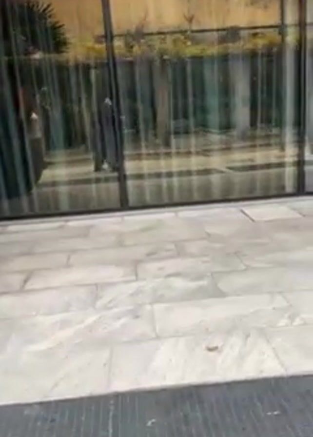 n exterior shot of a building. A person is seen walking past a glass window on the outside. The camera pans to the side to reveal a car parked near the building. The car is a reddish-brown color. The camera then focuses on the car's front tire.
