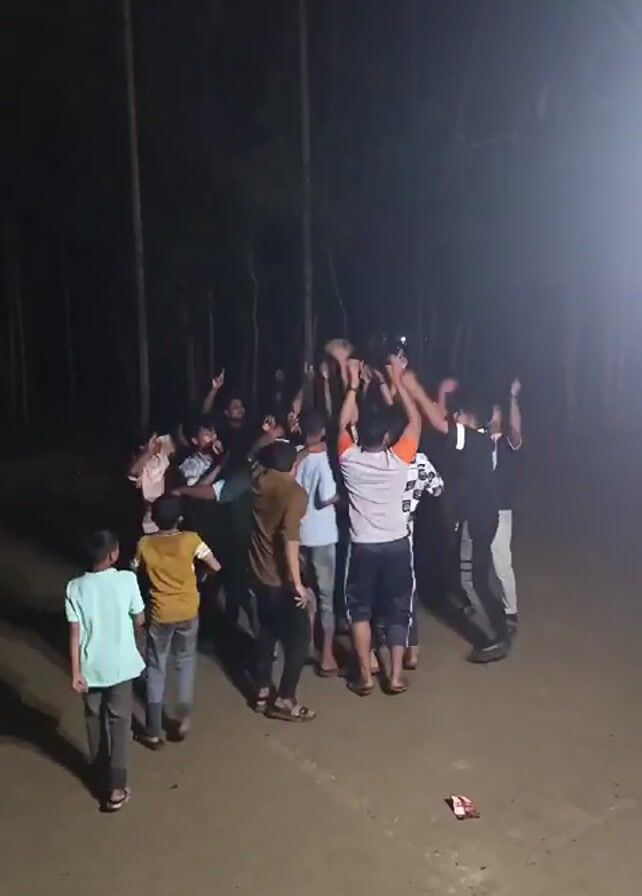 group of approximately 12 people dancing in a circle outdoors at night. The setting appears to be a sandy clearing surrounded by trees. The lighting is dim, with one bright light source illuminating the area. The individuals are of varying ages, including some children. They are all facing inward, raising their hands and moving rhythmically to music that is playing in the background. There are a few small objects scattered on the ground near the dancers.