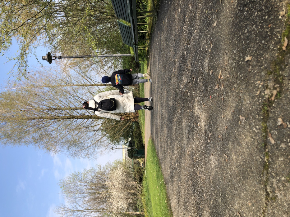 An adult female and a young child walk hand-in-hand away from the camera on a textured paved path in a park located in Rodano, Italy