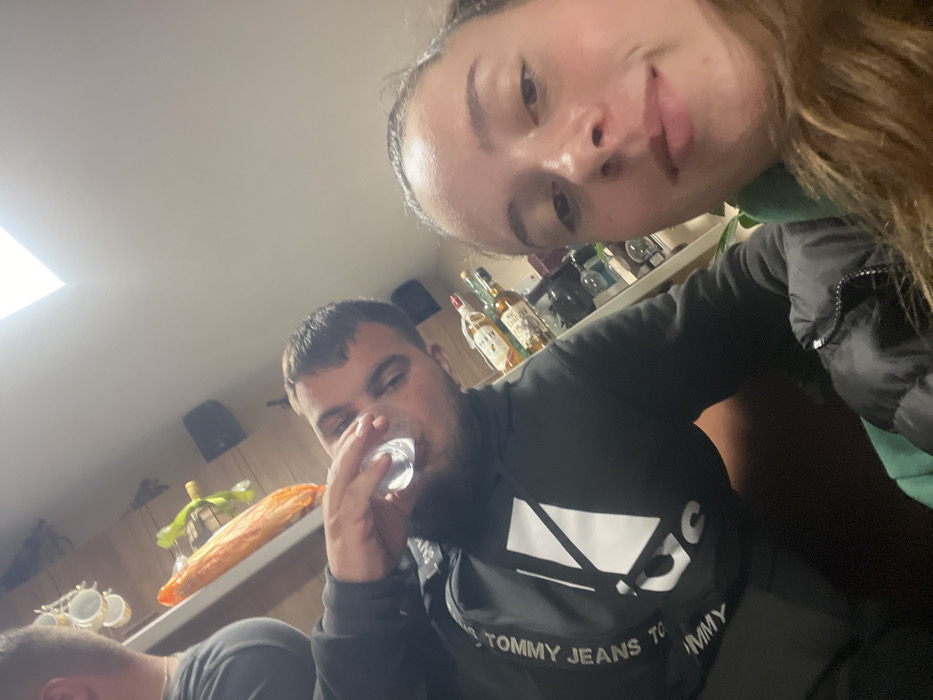 This image depicts an indoor social gathering in Byala, Bulgaria. In the foreground, a female with brown hair, wearing a black puffer jacket over a green garment, faces the camera with a neutral expression, positioned as if taking a self-portrait. To her left, a male with short dark hair and a light beard, wearing a black hooded sweatshirt with "TOMMY JEANS" and an Adidas logo, is captured in the act of drinking from a clear shot glass. The upper back and shoulder of a third individual, clad in a grey t-shirt, are partially visible on the far left. The background features a shelf holding several bottles of alcohol, including what appears to be whiskey, alongside an elongated orange packaged item, likely food, on a counter. Stacked white ceramic mugs or similar vessels are visible to the left. The room is illuminated by a prominent bright light source on the ceiling.