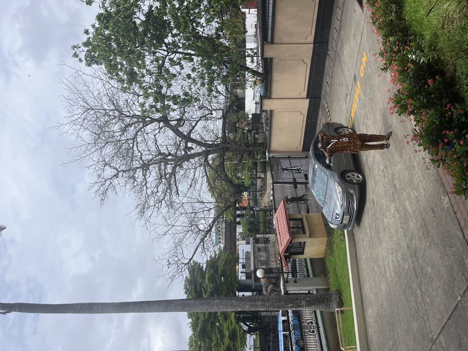 The image depicts an outdoor urban scene in Lagos, Nigeria, under an overcast sky. In the foreground, a concrete paved area shows yellow "NO PARKING" text. A single adult male stands with his hands clasped behind his head, wearing a brown and orange patterned traditional outfit and a white lanyard with an ID card. Behind him, a grey Peugeot sedan is parked, displaying a partial license plate "700 KM LAGOS." Behind the vehicle and man, a small, beige security booth with a red roof sits adjacent to a black metal gate. Beyond this gate, a street is visible where a blue public transit bus passes. Numerous trees are present, including a very tall, slender palm tree on the far left, a large leafless deciduous tree with extensive branching in the upper mid-ground, and other green-leafed trees. Buildings are visible in the background, with one displaying "courtwise" on its facade. A low, light beige wall with a dark base defines the right side of the paved area, with green bushes bearing small pink flowers in the immediate foreground.