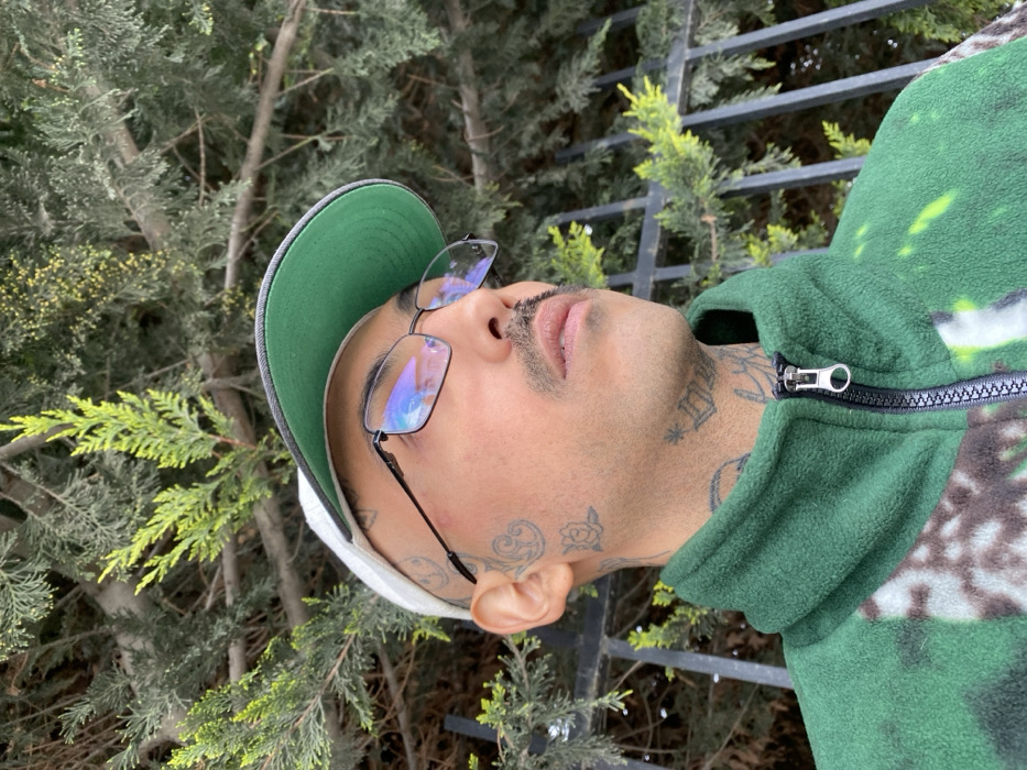 A man with a mustache, wearing glasses and a baseball cap with a green brim, gazes upwards. He's wearing a green fleece jacket with a partial zipper. Tattoos are visible on his neck and face. He is standing outside with greenery behind him. A metal fence is visible in the background. The image is taken from a low angle.