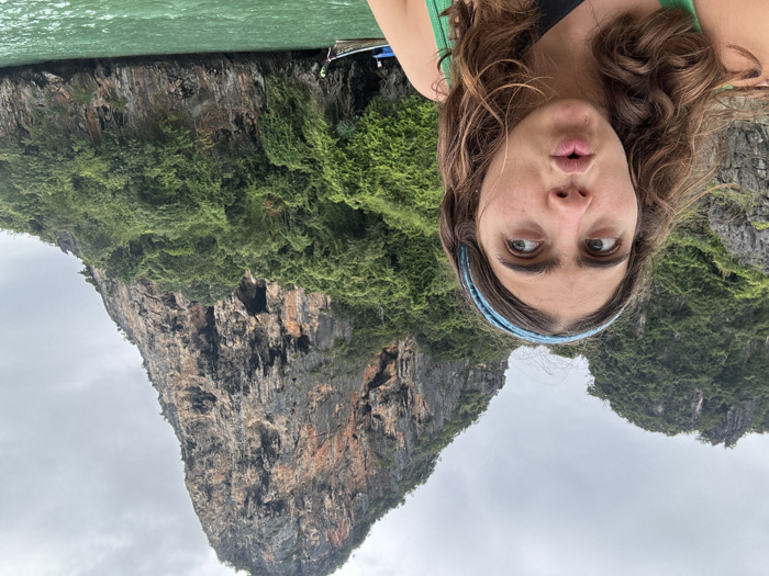 A photograph taken in Ao Nang, Thailand, features a young female occupying the foreground-left, positioned on turquoise-green water