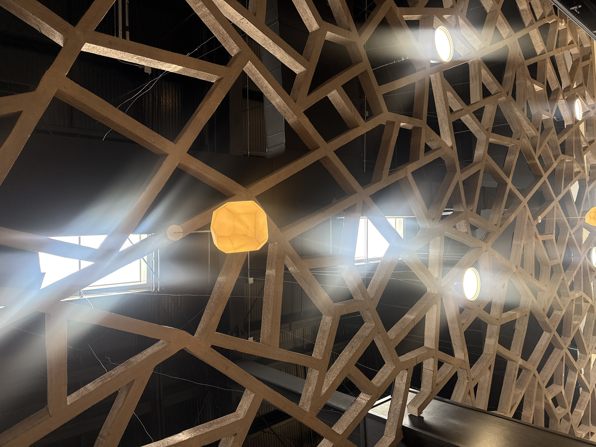n interior ceiling in San Andrés Cholula, Mexico. A geometric pattern of light brown wood beams forms a web-like structure across the ceiling. Light fixtures, some round and some with a more irregular, yellowish shade, are integrated into the design. A window providing natural light is visible through the gaps in the wood structure. The background appears to be a dark or black ceiling. Some wires and ventilation components are visible behind the wooden beams.