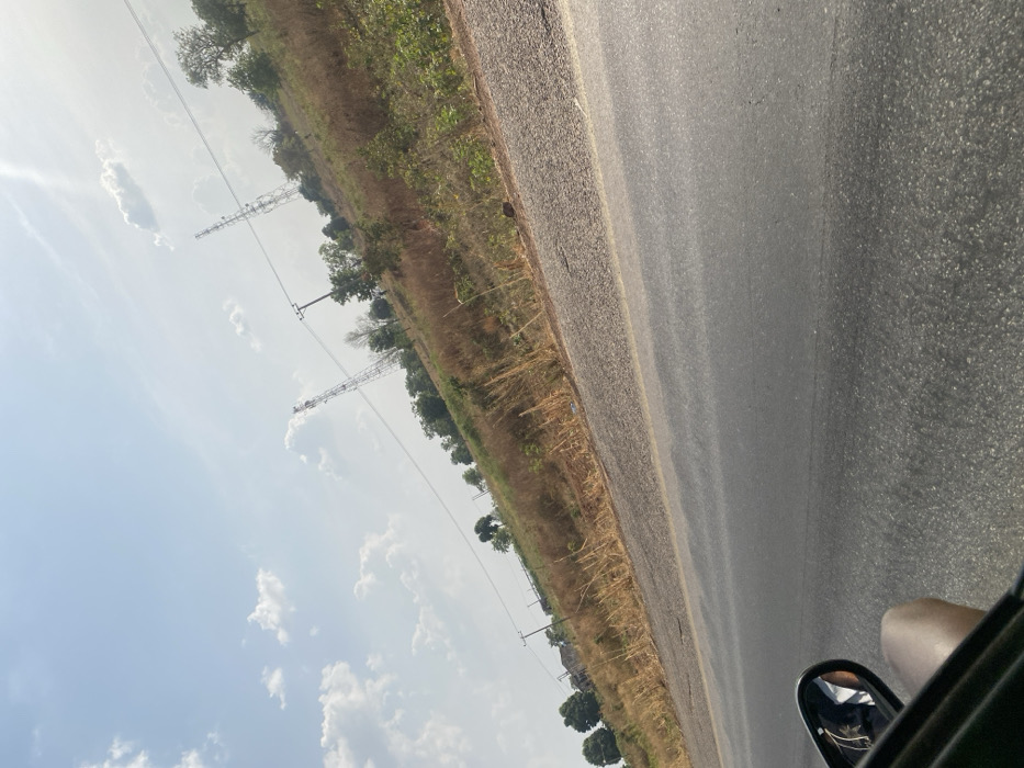 A tilted view from inside a moving vehicle shows an asphalt road stretching ahead. Parallel to the road, dry grassland meets scattered trees under a bright, cloudy sky. Power lines with support towers run along the tree line, adding a linear element to the landscape. A side mirror is visible in the lower right corner, reflecting the interior of the vehicle. The overall impression is of movement and a rural setting.