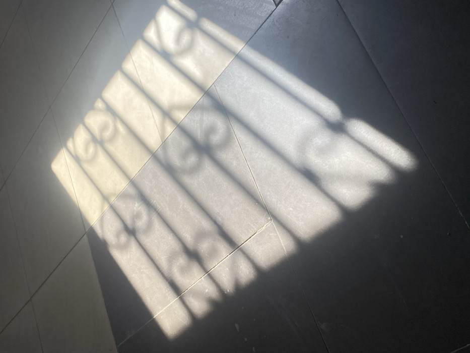 The image displays an indoor tiled floor under natural illumination. The floor is composed of light-toned square or rectangular tiles with visible grout lines. Direct sunlight enters the space, casting a prominent, diagonal pattern of shadows onto the floor, extending from the upper-left to the lower-right of the frame. These shadows are consistent with an architectural security grill, displaying multiple vertical bars interconnected by intricate, scrolled decorative elements. The areas of the floor not exposed to direct sunlight appear darker. No individuals or specific objects beyond the floor and implied window/grill are visible. The image contains no discernible features that identify a specific location within Jos, Nigeria.